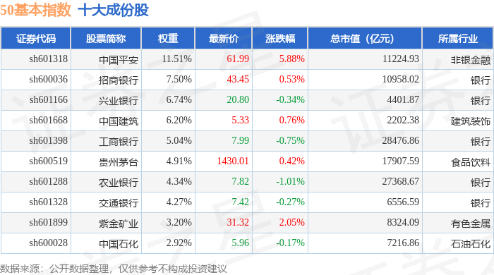 证券之星消息,12月5日,50基本(000052)指数报收于3001.73点,涨1.11%,成交1104.47亿元,换手率0.26%。当日该指数成份股中,上涨的有28家,中国太保以6.85%的涨幅领涨,下跌的有22家,中国银行以1.19%的跌幅领跌。