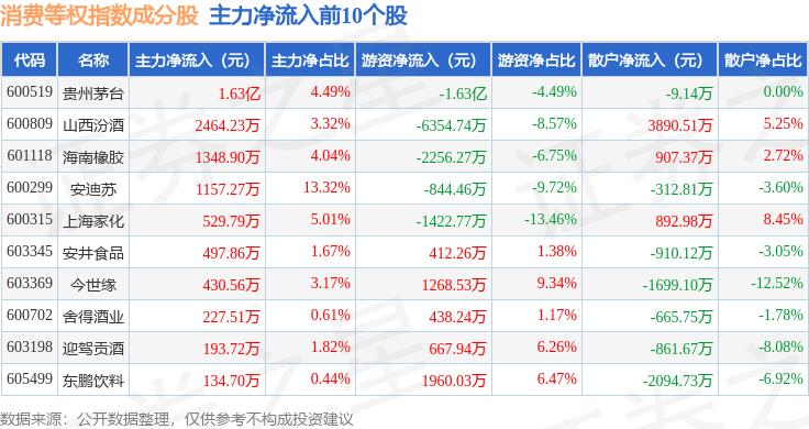 资金流向方面,消费等权(000074)指数成份股当日主力资金净流出合计4913.97万元,游资资金净流出合计1.6亿元,散户资金净流入合计2.09亿元。成份股资金流向详情见下表:
