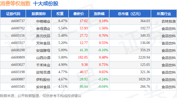 证券之星消息,12月5日,消费等权(000074)指数报收于7164.59点,涨0.34%,成交96.01亿元,换手率0.56%。当日该指数成份股中,上涨的有22家,海南橡胶以2.81%的涨幅领涨,下跌的有8家,东鹏饮料以1.33%的跌幅领跌。