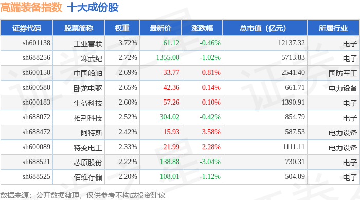 高端装备(000097)指数十大成份股详情如下: