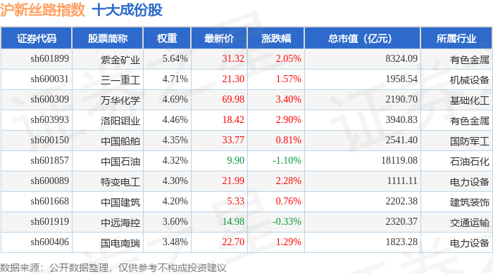 证券之星消息,12月5日,沪新丝路(000160)指数报收于2076.64点,涨1.19%,成交538.48亿元,换手率0.59%。当日该指数成份股中,上涨的有53家,振华重工以6.14%的涨幅领涨,下跌的有13家,招商轮船以5.88%的跌幅领跌。