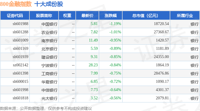 证券之星消息,12月5日,800金融(000974)指数报收于6935.69点,涨1.37%,成交901.34亿元,换手率0.61%。当日该指数成份股中,上涨的有31家,中国太保以6.85%的涨幅领涨,下跌的有13家,中国银行以1.19%的跌幅领跌。