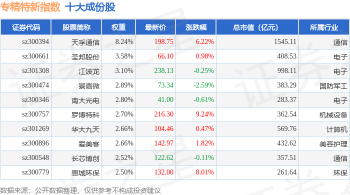 专精特新(399267)指数十大成份股详情如下:
