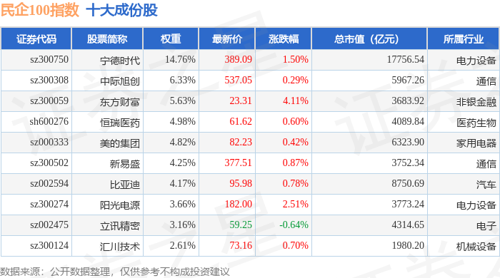 民企100(399362)指数十大成份股详情如下: