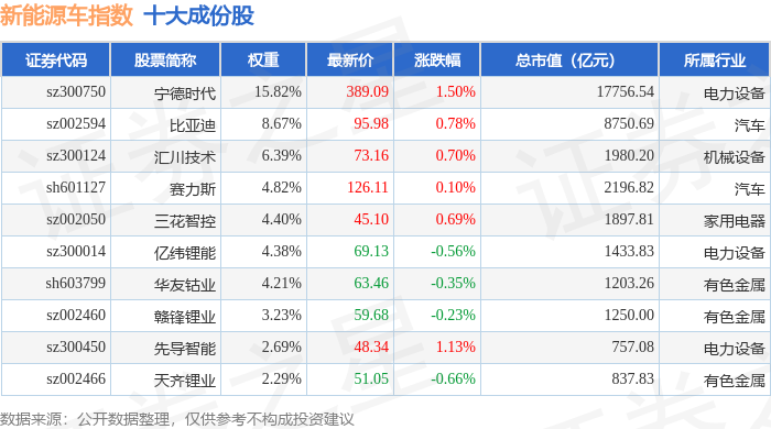 证券之星消息,12月5日,新能源车(399417)指数报收于3767.7点,涨0.56%,成交697.33亿元,换手率2.23%。当日该指数成份股中,上涨的有30家,金力永磁以8.07%的涨幅领涨,下跌的有19家,天华新能以4.36%的跌幅领跌。