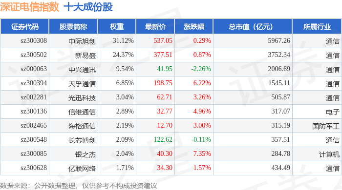 深证电信(399621)指数十大成份股详情如下: