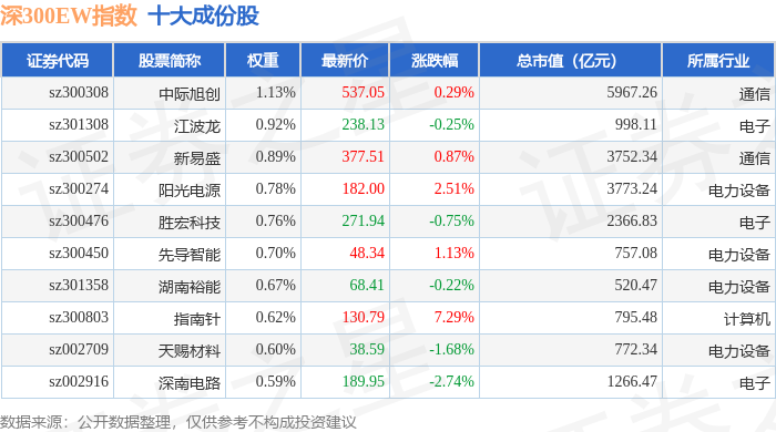 深300EW(399633)指数十大成份股详情如下: