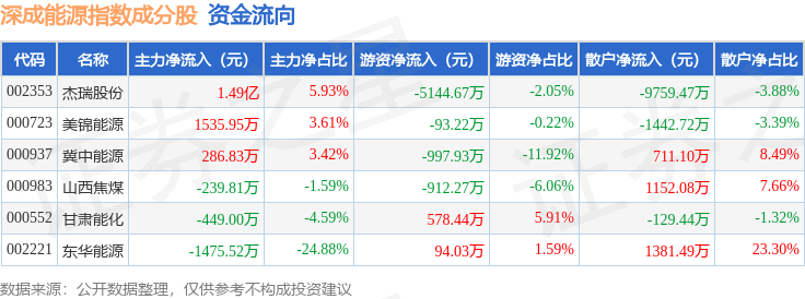 资金流向方面,深成能源(399680)指数成份股当日主力资金净流入合计1.46亿元,游资资金净流出合计6475.62万元,散户资金净流出合计8086.95万元。成份股资金流向详情见下表: