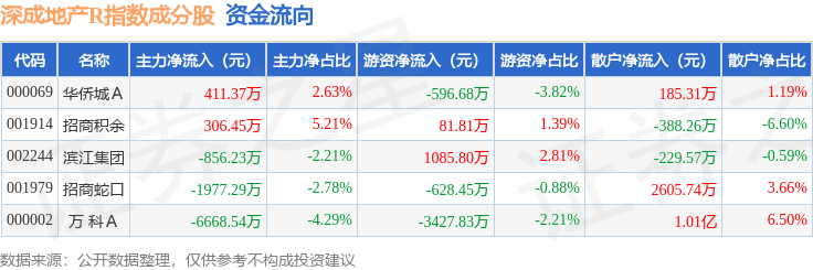资金流向方面,深成地产R(471001)指数成份股当日主力资金净流出合计8784.24万元,游资资金净流出合计3485.35万元,散户资金净流入合计1.23亿元。成份股资金流向详情见下表: