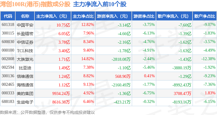 资金流向方面,湾创100R(港币)(480002)指数成份股当日主力资金净流入合计3.44亿元,游资资金净流出合计13.84亿元,散户资金净流入合计10.41亿元。成份股资金流向详情见下表:
