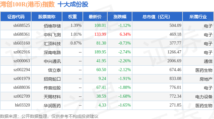 湾创100R(港币)(480002)指数十大成份股详情如下: