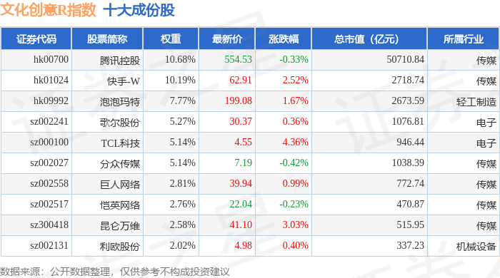 文化创意R(480046)指数十大成份股详情如下:
