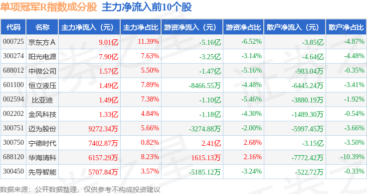 资金流向方面,单项冠军R(480150)指数成份股当日主力资金净流入合计3.49亿元,游资资金净流出合计6.82亿元,散户资金净流入合计3.34亿元。成份股资金流向详情见下表: