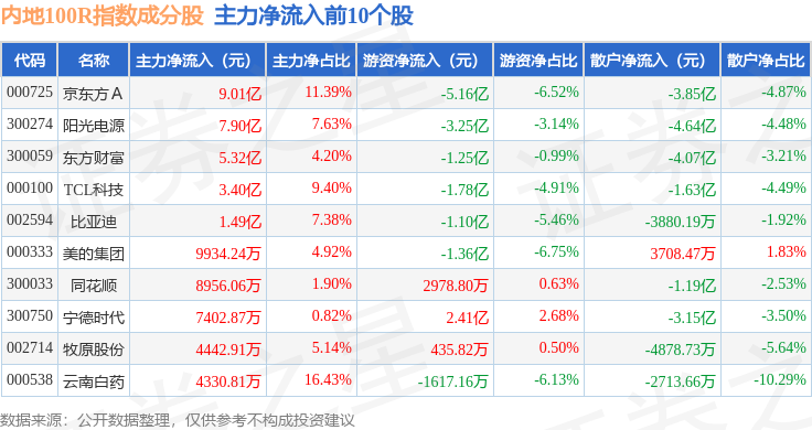 资金流向方面,内地100R(483001)指数成份股当日主力资金净流出合计3.97亿元,游资资金净流入合计5.39亿元,散户资金净流出合计1.43亿元。成份股资金流向详情见下表:
