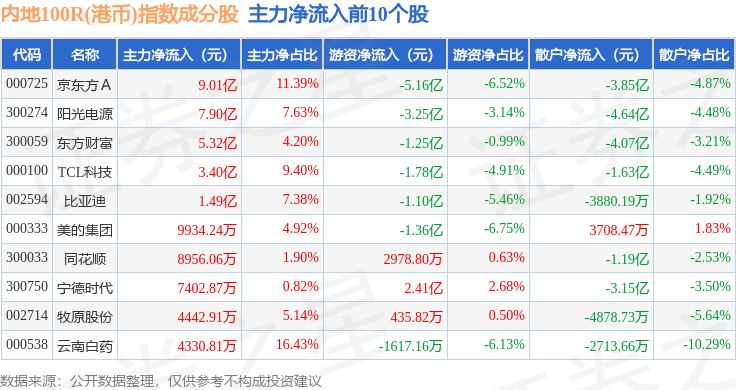 资金流向方面,内地100R(港币)(483002)指数成份股当日主力资金净流出合计3.97亿元,游资资金净流入合计5.39亿元,散户资金净流出合计1.43亿元。成份股资金流向详情见下表: