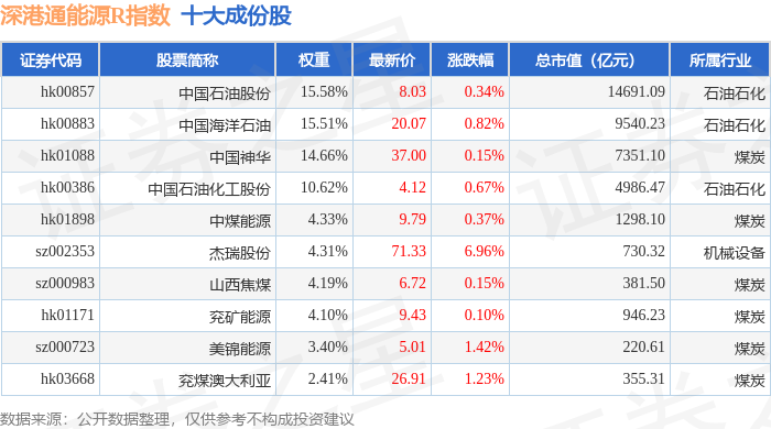 资金流向方面,深港通能源R(483013)指数成份股当日主力资金净流入合计1.12亿元,游资资金净流出合计8606.26万元,散户资金净流出合计2595.74万元。成份股资金流向详情见下表:
