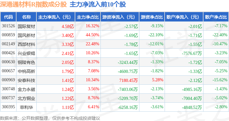 资金流向方面,深港通材料R(483015)指数成份股当日主力资金净流入合计13.89亿元,游资资金净流出合计17.15亿元,散户资金净流入合计3.26亿元。成份股资金流向详情见下表:
