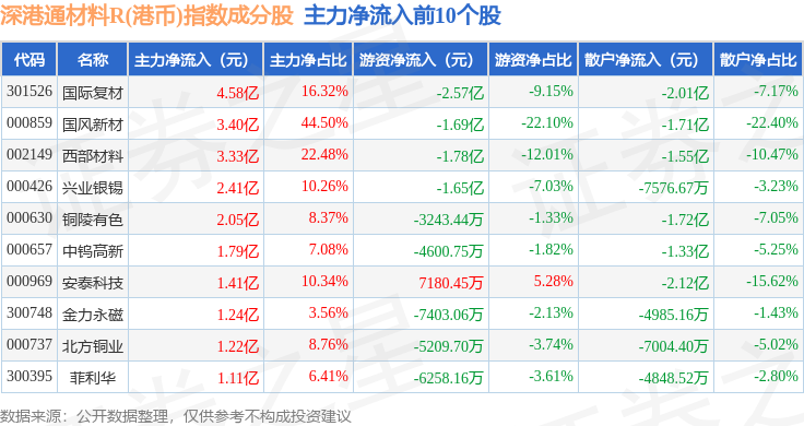 资金流向方面,深港通材料R(港币)(483016)指数成份股当日主力资金净流入合计13.89亿元,游资资金净流出合计17.15亿元,散户资金净流入合计3.26亿元。成份股资金流向详情见下表: