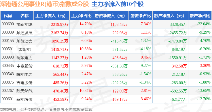 资金流向方面,深港通公用事业R(港币)(483032)指数成份股当日主力资金净流出合计3558.7万元,游资资金净流入合计518.93万元,散户资金净流入合计3039.78万元。成份股资金流向详情见下表: