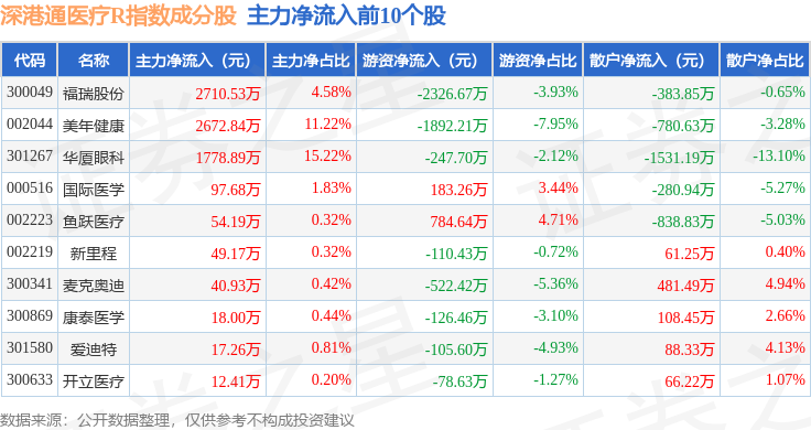 资金流向方面,深港通医疗R(483035)指数成份股当日主力资金净流出合计2.24亿元,游资资金净流出合计2064.25万元,散户资金净流入合计2.44亿元。成份股资金流向详情见下表: