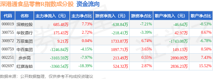 资金流向方面,深港通食品零售R(483037)指数成份股当日主力资金净流出合计6840.84万元,游资资金净流入合计2712.14万元,散户资金净流入合计4128.7万元。成份股资金流向详情见下表: