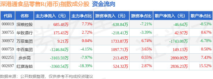 资金流向方面,深港通食品零售R(港币)(483038)指数成份股当日主力资金净流出合计6840.84万元,游资资金净流入合计2712.14万元,散户资金净流入合计4128.7万元。成份股资金流向详情见下表: