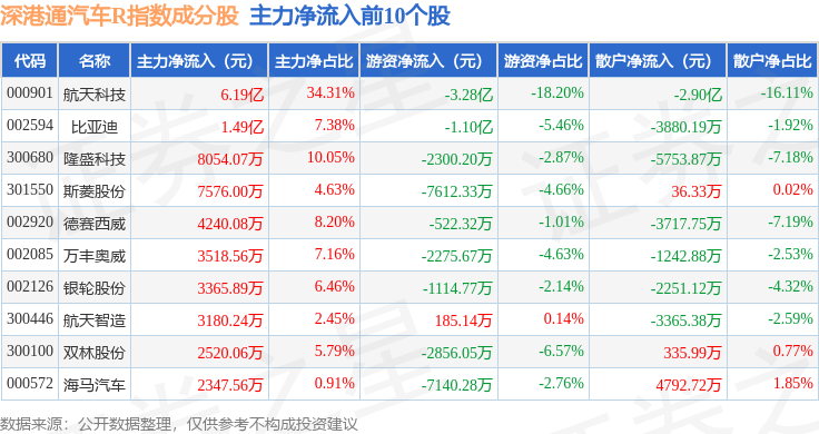 资金流向方面,深港通汽车R(483039)指数成份股当日主力资金净流入合计5.49亿元,游资资金净流出合计7.86亿元,散户资金净流入合计2.37亿元。成份股资金流向详情见下表: