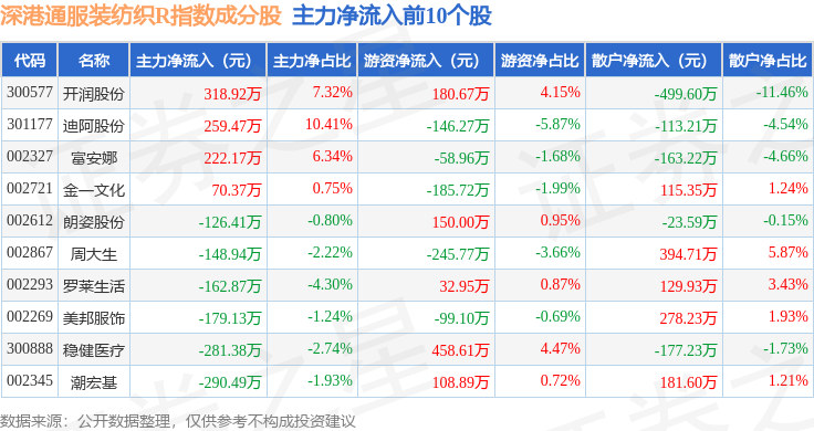 资金流向方面,深港通服装纺织R(483041)指数成份股当日主力资金净流出合计1.29亿元,游资资金净流出合计5891.0万元,散户资金净流入合计1.88亿元。成份股资金流向详情见下表: