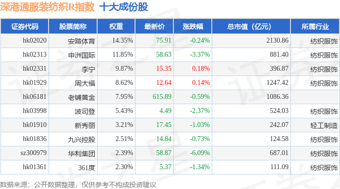 深港通服装纺织R(483041)指数十大成份股详情如下: