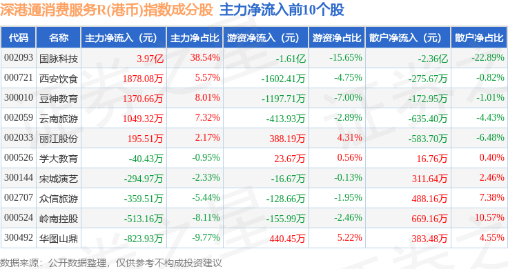 资金流向方面,深港通消费服务R(港币)(483046)指数成份股当日主力资金净流入合计3.22亿元,游资资金净流出合计2.0亿元,散户资金净流出合计1.23亿元。成份股资金流向详情见下表: