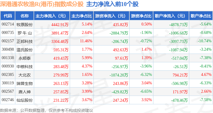 资金流向方面,深港通农牧渔R(港币)(483052)指数成份股当日主力资金净流入合计2175.64万元,游资资金净流出合计612.72万元,散户资金净流出合计1562.92万元。成份股资金流向详情见下表:
