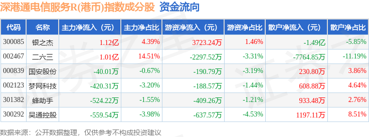 资金流向方面,深港通电信服务R(港币)(483058)指数成份股当日主力资金净流入合计1.97亿元,游资资金净流出合计0.47万元,散户资金净流出合计1.97亿元。成份股资金流向详情见下表: