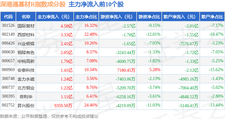 资金流向方面,深港通基材R(483061)指数成份股当日主力资金净流入合计20.11亿元,游资资金净流出合计14.98亿元,散户资金净流出合计5.13亿元。成份股资金流向详情见下表: