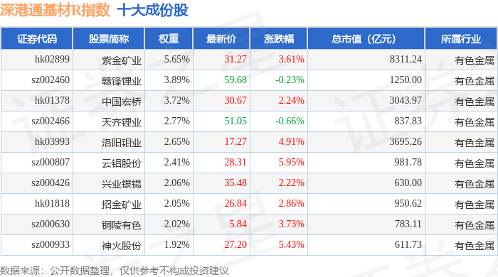 深港通基材R(483061)指数十大成份股详情如下: