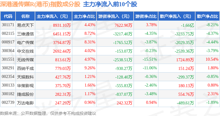 资金流向方面,深港通传媒R(港币)(483076)指数成份股当日主力资金净流出合计4.29亿元,游资资金净流出合计8768.94万元,散户资金净流入合计5.16亿元。成份股资金流向详情见下表: