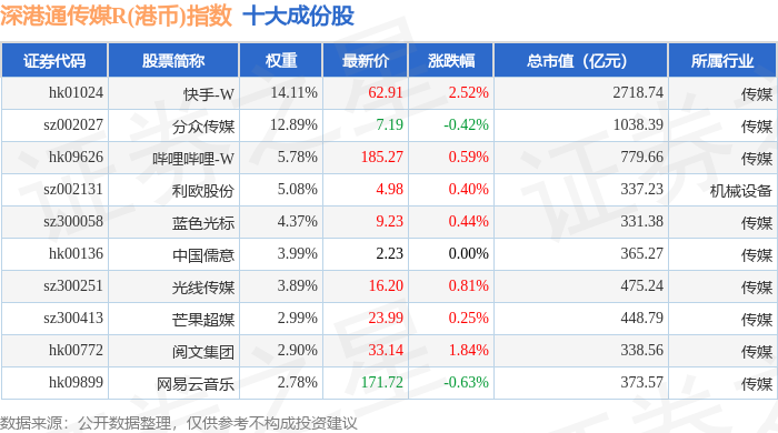 深港通传媒R(港币)(483076)指数十大成份股详情如下: