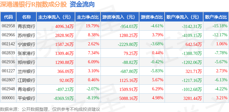 资金流向方面,深港通银行R(483081)指数成份股当日主力资金净流入合计2704.11万元,游资资金净流入合计5122.27万元,散户资金净流出合计7826.37万元。成份股资金流向详情见下表: