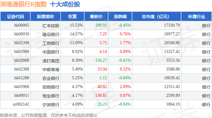 深港通银行R(483081)指数十大成份股详情如下: