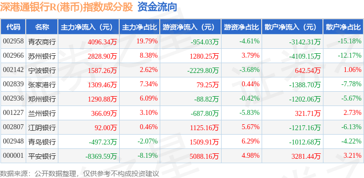 资金流向方面,深港通银行R(港币)(483082)指数成份股当日主力资金净流入合计2704.11万元,游资资金净流入合计5122.27万元,散户资金净流出合计7826.37万元。成份股资金流向详情见下表: