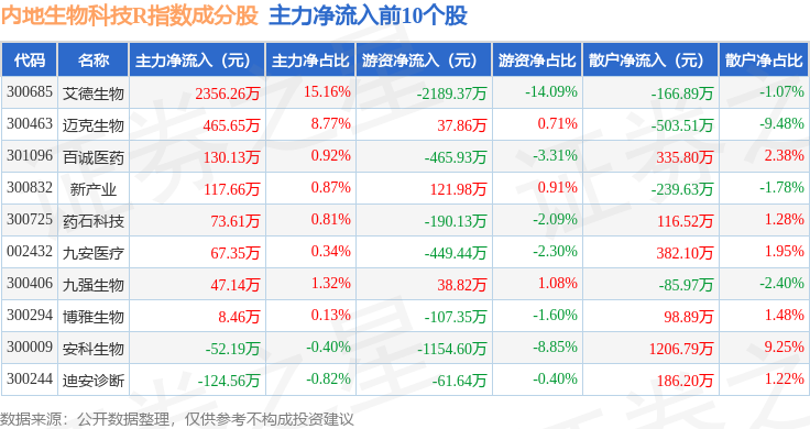 资金流向方面,内地生物科技R(483101)指数成份股当日主力资金净流出合计3.96亿元,游资资金净流出合计209.13万元,散户资金净流入合计3.98亿元。成份股资金流向详情见下表: