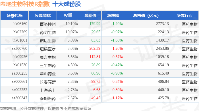 证券之星消息,12月5日,内地生物科技R(483101)指数报收于3374.46点,涨0.1%,成交119.15亿元,换手率0.79%。当日该指数成份股中,上涨的有36家,康华生物以3.85%的涨幅领涨,下跌的有14家,信达生物以1.66%的跌幅领跌。