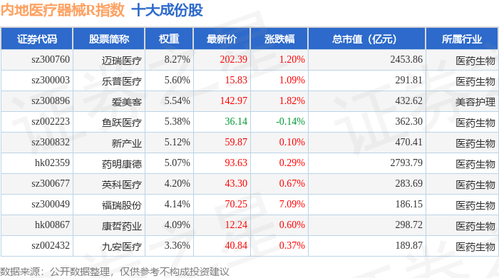 内地医疗器械R(483103)指数十大成份股详情如下:
