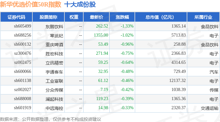 新华优选价值50R(489004)指数十大成份股详情如下: