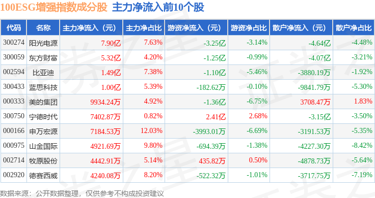 资金流向方面,100ESG增强(970033)指数成份股当日主力资金净流出合计6.93亿元,游资资金净流入合计6.34亿元,散户资金净流入合计5883.89万元。成份股资金流向详情见下表: