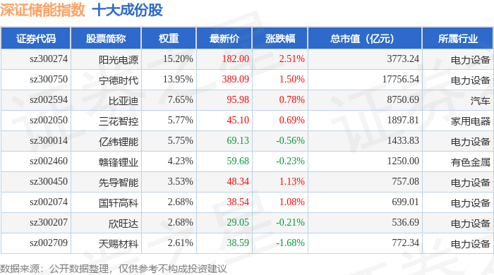 深证储能(970036)指数十大成份股详情如下: