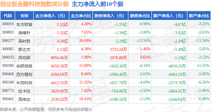 资金流向方面,创业板金融科技(970085)指数成份股当日主力资金净流入合计19.04亿元,游资资金净流出合计5.87亿元,散户资金净流出合计13.17亿元。成份股资金流向详情见下表: