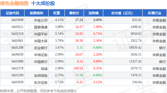 绿色金融(980052)指数十大成份股详情如下: