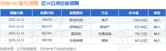 近10日内内地100(港币)(983002)指数成份股做了调整,新纳入了4只股票。