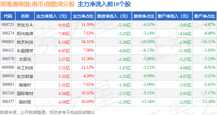 资金流向方面,深港通综指(港币)(983006)指数成份股当日主力资金净流入合计33.86亿元,游资资金净流出合计70.6亿元,散户资金净流入合计36.75亿元。成份股资金流向详情见下表: