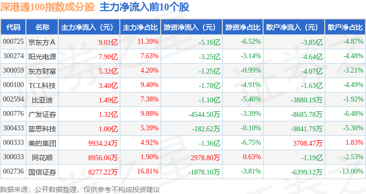 资金流向方面,深港通100(983007)指数成份股当日主力资金净流入合计3982.01万元,游资资金净流入合计4.25亿元,散户资金净流出合计4.65亿元。成份股资金流向详情见下表: